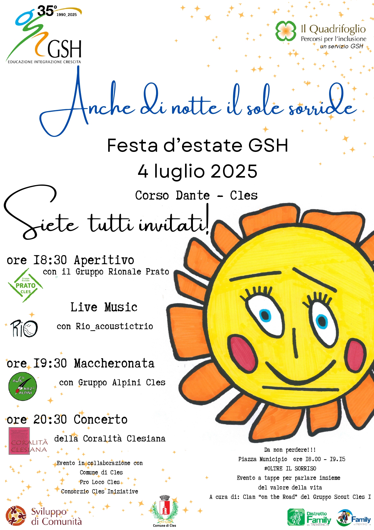 Siete tutti invitati alla Festa d'estate GSH che si svolgerà a partire dalle ore 18.00 il 4 Luglio 2025 in Corso Dante nel Comune di Cles